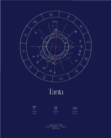 Discover the art of astrology with a personalized print based on your birth chart, Created from your birth date, and location, this exclusive piece fuses design and energy to help you connect with you essence and transform your space.